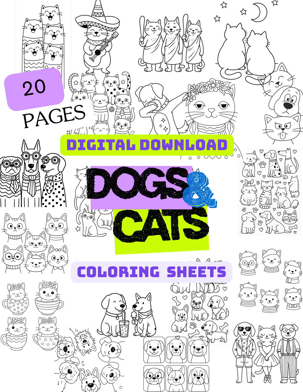 This collection includes a variety of cats coloring sheets and dogs coloring sheets, featuring cute characters, bold outlines, and child-friendly designs ideal for both beginners and confident little artists. Whether you’re looking for cats coloring pages, a cats coloring book style activity, or simply coloring pictures of cats and dogs, this set offers plenty of creativity-packed options!